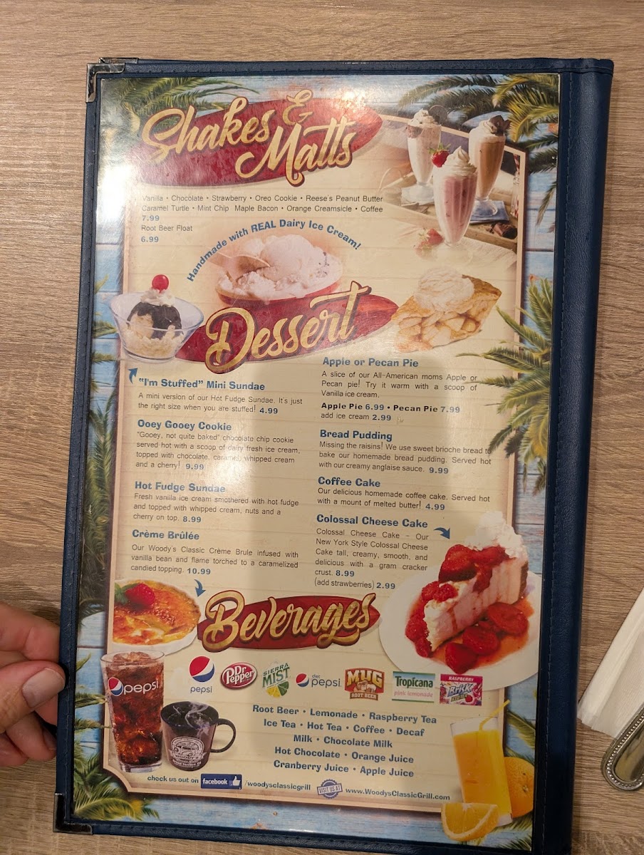 No meal is complete without dessert, and Woody's has you covered. Savor the Creme Brulee, an exquisite classic infused with rich vanilla bean, then caramelized to glossy perfection, or dive into a Hot Fudge Sundae that will make your heart sing—a scoop of fresh vanilla ice cream drenched in hot fudge, topped with whipped cream, nuts, and a cherry on top for just $9.99.